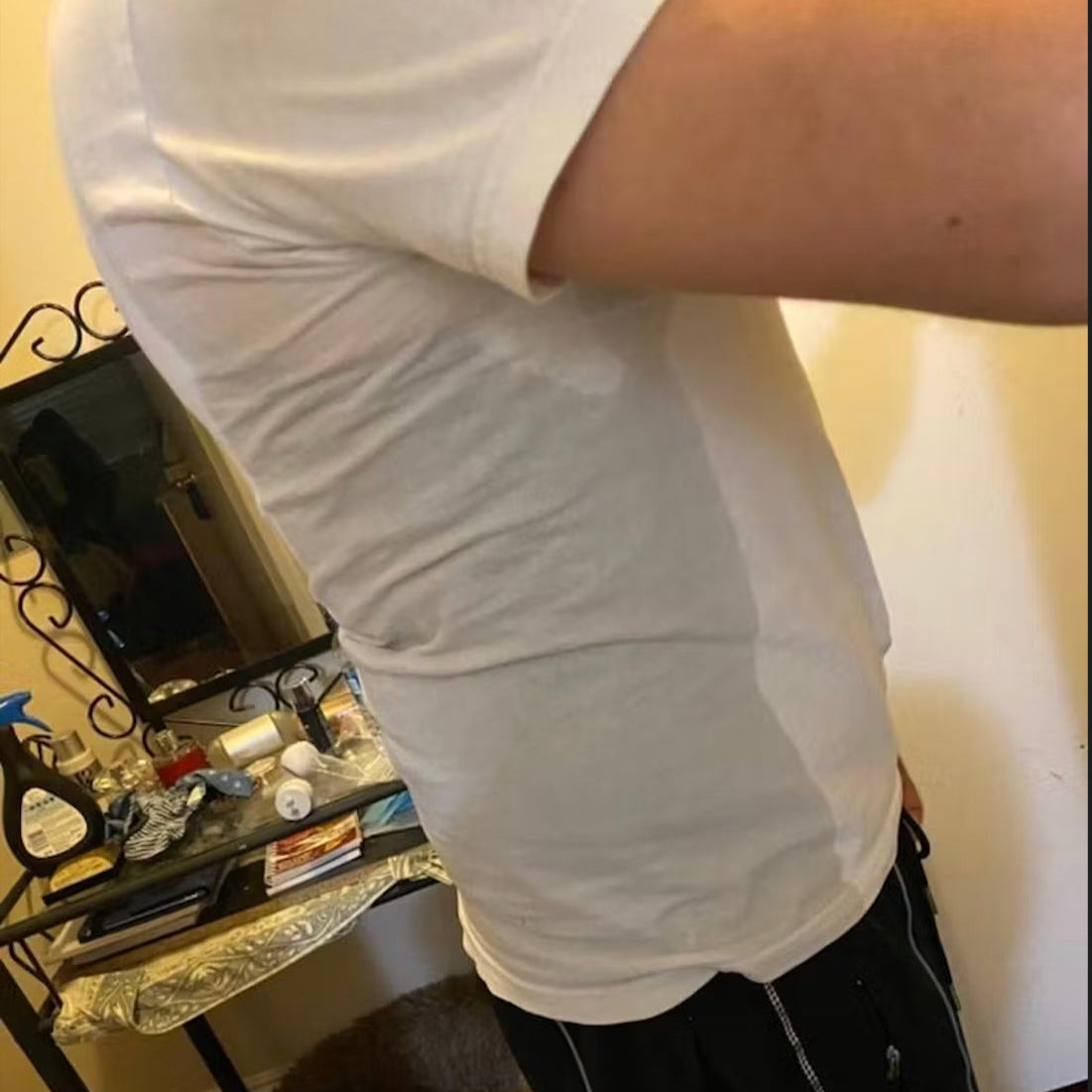 No! The shirt is designed to be discreet. While you'll be sweating heavily, the moisture stays trapped inside the shirt. The outer layer remains dry, so there are no embarrassing sweat stains showing through your work clothes or everyday outfits.